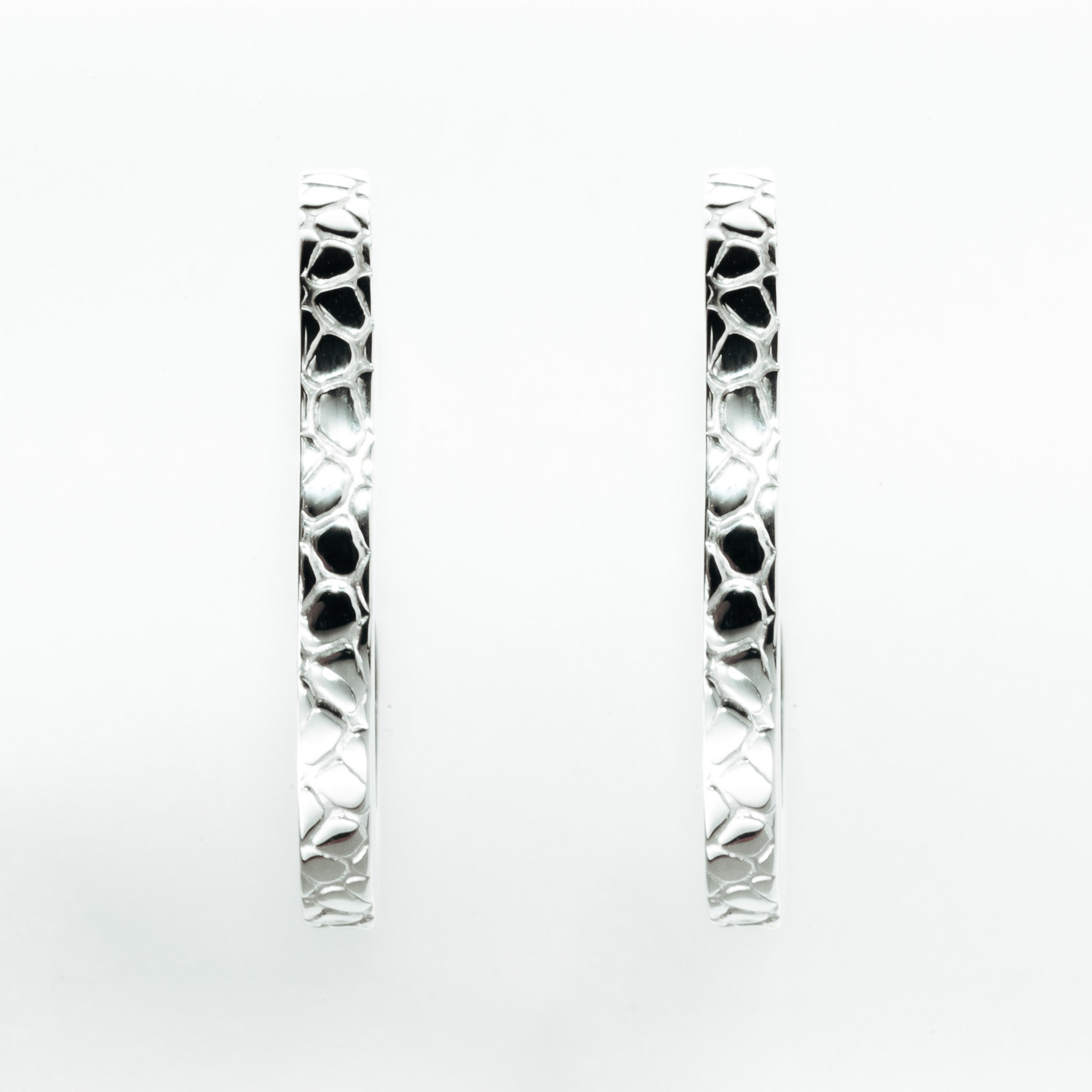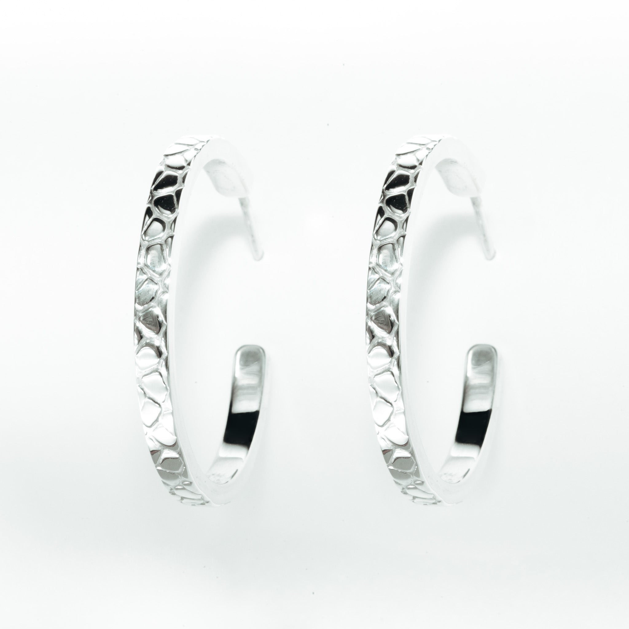 The Calf Skin Hoop Earrings reinterpret a classic hoop through texture and material. Crafted from solid 925 silver, the surface carries a leather-inspired impression that adds tactility without overpowering the clean circular form. Balanced in weight and handmade in our UK workshop, these hoops are designed to move naturally and elevate everyday wear.