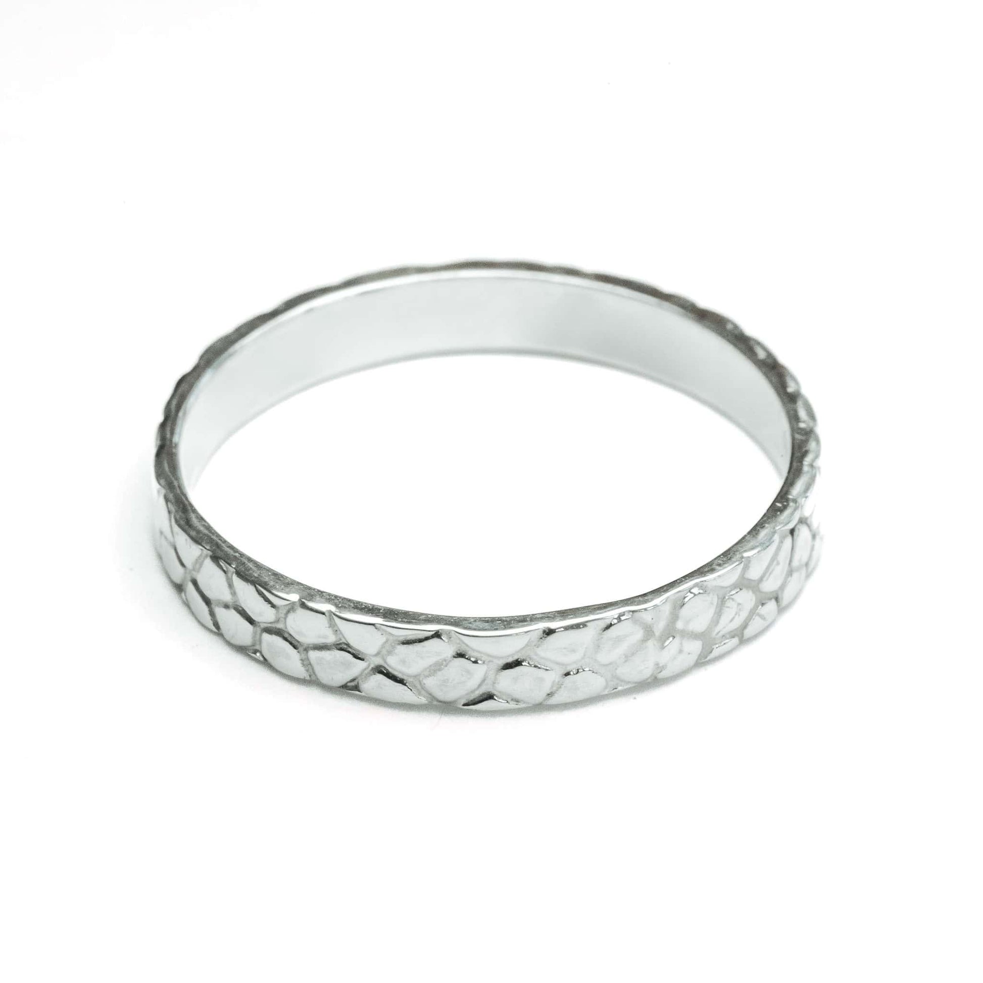 Alex&er Thick Skinned Collection boasts intricacy in a redefined way. The rings engage the owner in the tactility we find in real animal furs and skins, but not at the expense of an innocent creature. Calf skin is embossed across the entire surface of the sterling silver ring, wearable as a statement piece alongside any fashion style.