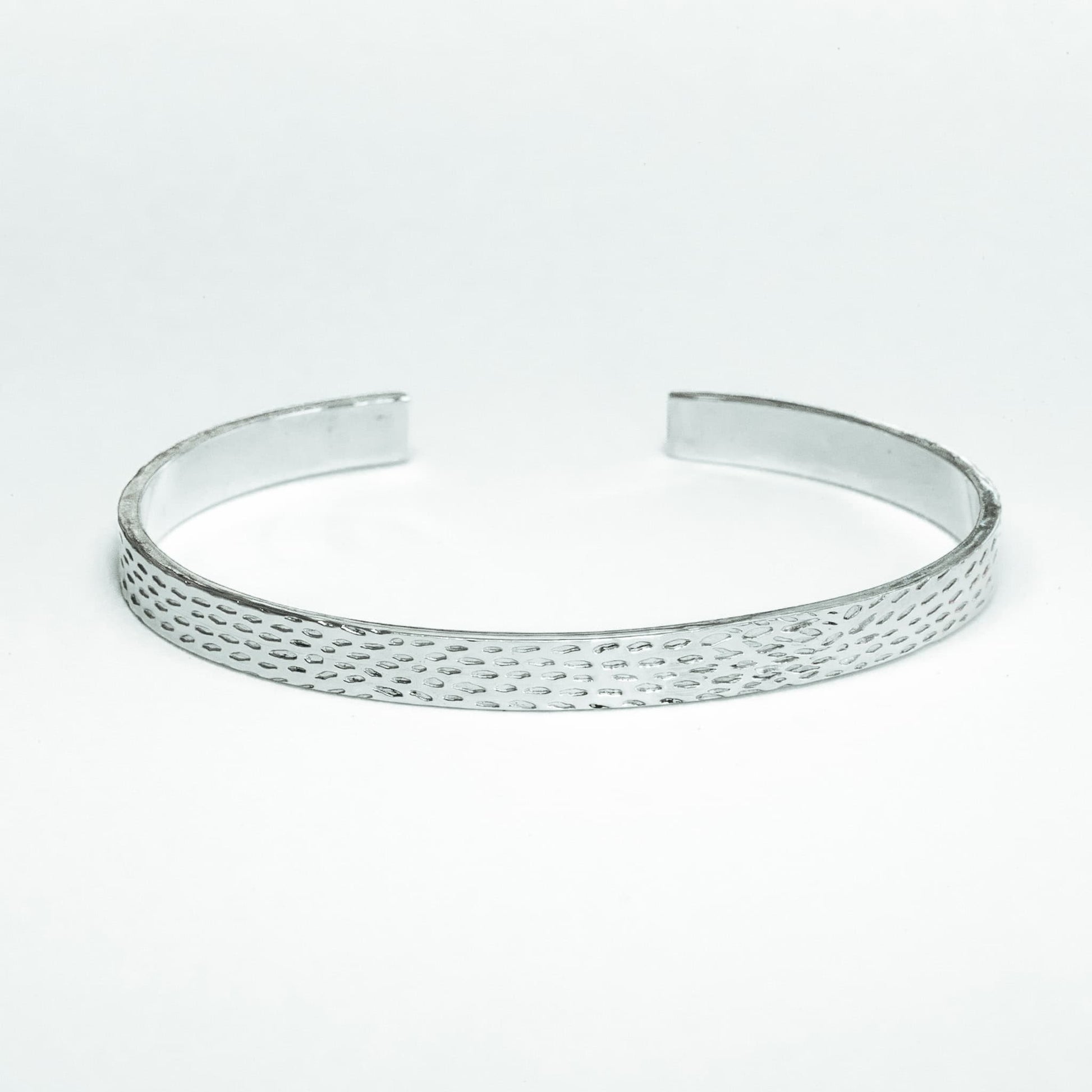 Using traditional techniques, this cuff starts off as a single strip of 925 silver, it is formed, rolled and manipulated into a textured cuff.